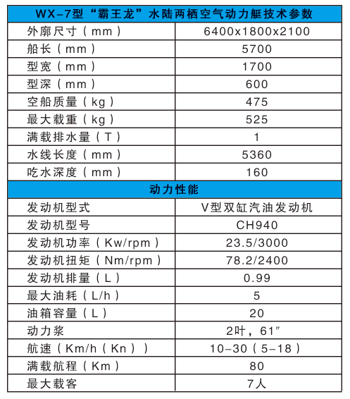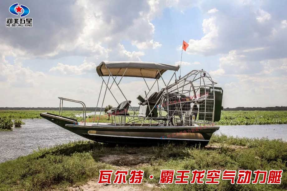 河北五星“霸王龍”水陸兩棲空氣動力艇是一種運用空氣動力學(xué)、采用航空發(fā)動機(jī)和空氣螺旋槳推動,通過置于船體上部的大功率內(nèi)燃機(jī)帶動碳纖維螺旋槳產(chǎn)生空氣動力的多地形交通工具。所搭載的航空發(fā)動機(jī)動力系統(tǒng)強(qiáng)勁,功率可達(dá)300馬力以上,螺旋槳推力可達(dá)500公斤以上,操縱機(jī)動靈活,靜水巡航速度可達(dá)40km/h,可以高時速可達(dá)70km--120km/h。