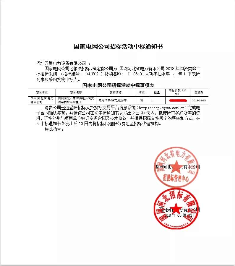 國家電網(wǎng)公司經(jīng)依法招標,確定河北五星公司為國網(wǎng)河北省電力有限公司“”2018 年物資類第二批招標采購 (招標編號: 041802 )”項目中,河北五星研制生產(chǎn)的“大流量應急搶險排澇車”一舉中標?。?/span>